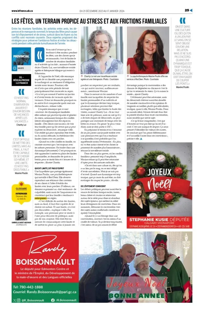 I was interviewed in Le Franco about how the holiday season can heighten stress and family tensions, and I shared strategies for setting boundaries and protecting well-being during this time of year.